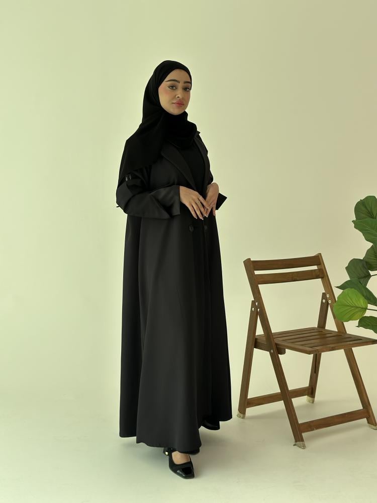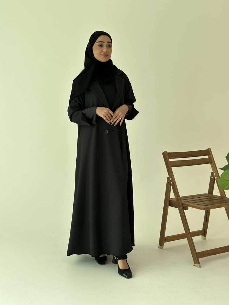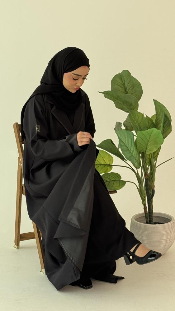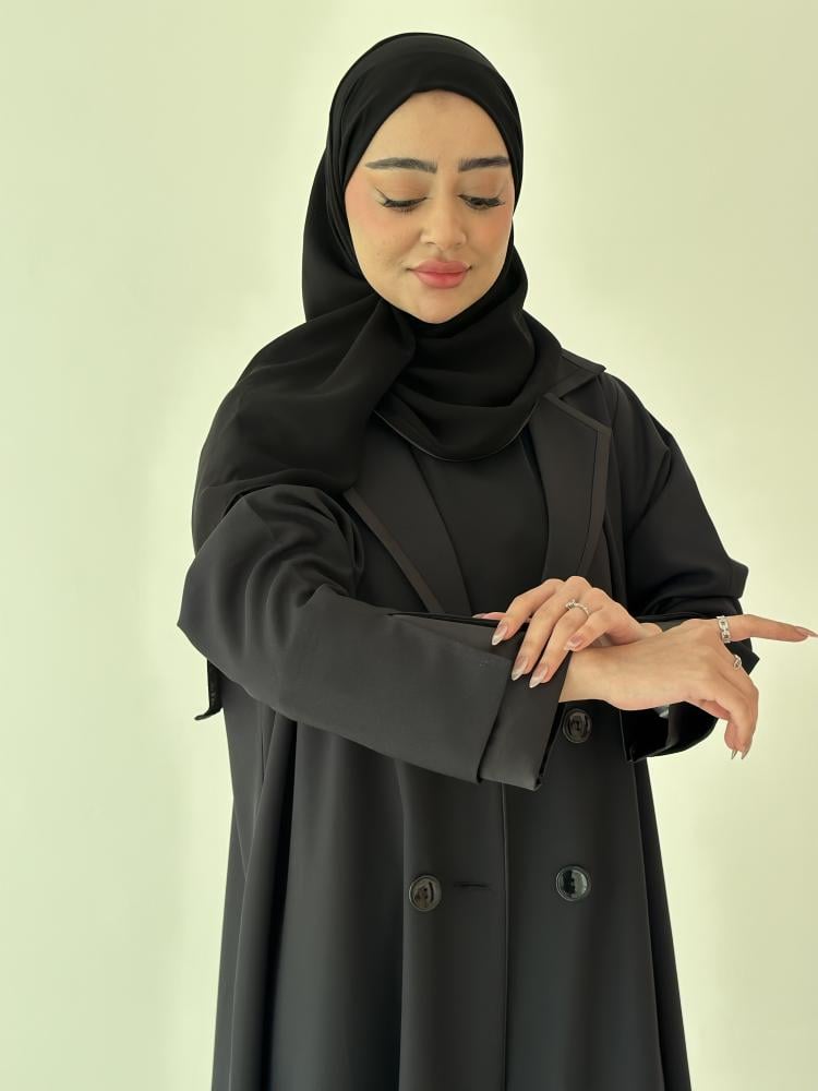 - التصميم: عباية بليزر اسود مفتوحة بقَصة A Line، سادة وتتزين بأزرار سوداء دائرية كبيرة