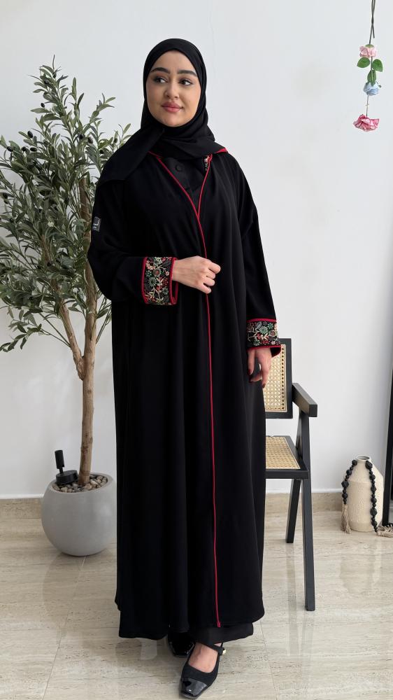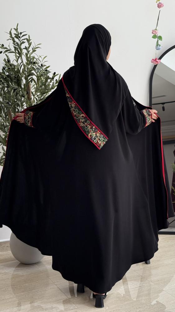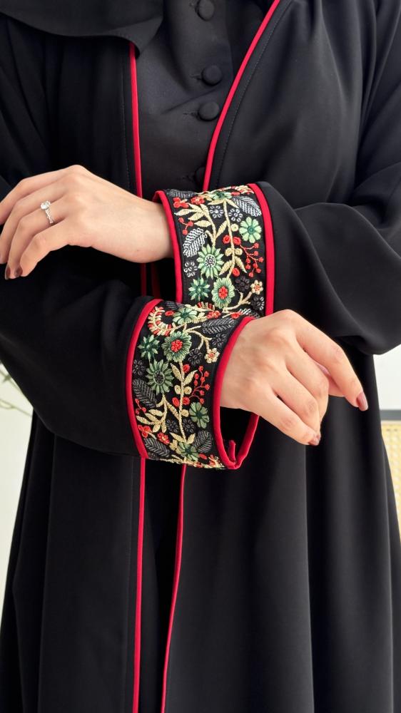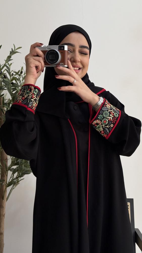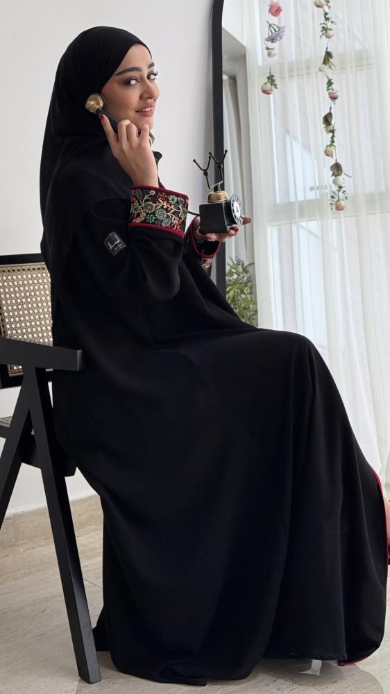 • التصميم: عباية بقَصة نص كلوش واسعة، وسادة ما عدا الأطراف المطرزة للأكمام وطرف قماشي من الأمام بالون الأحمر