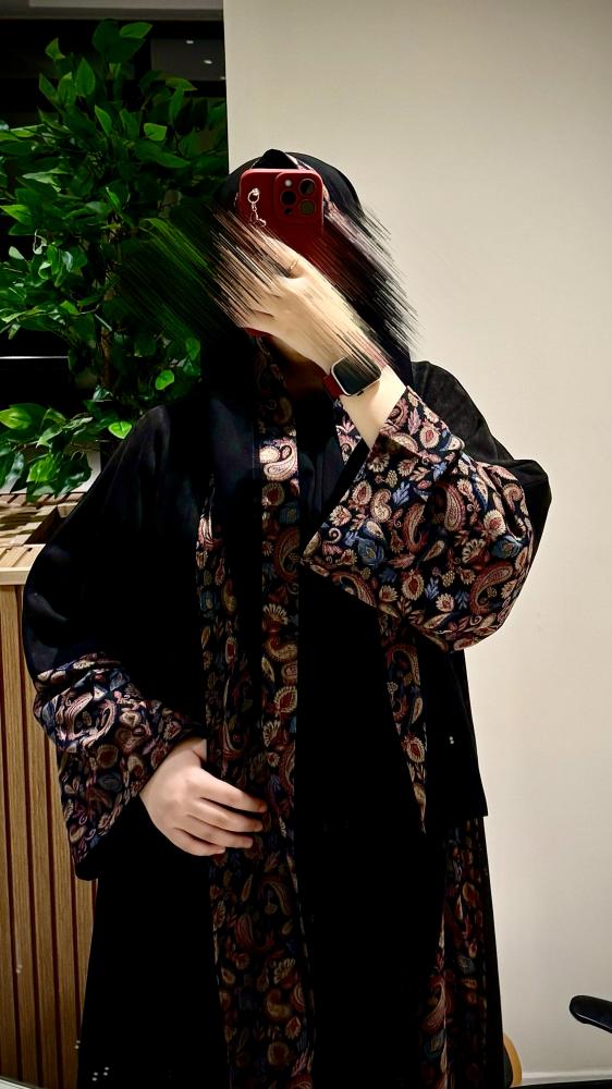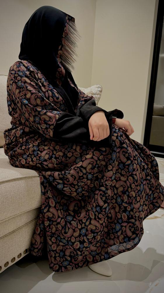 - التصميم: دبل فيس عبايه، نص كلوش عبايه واسعة مفتوحة، سادة مع أطراف وأساور مشجرة