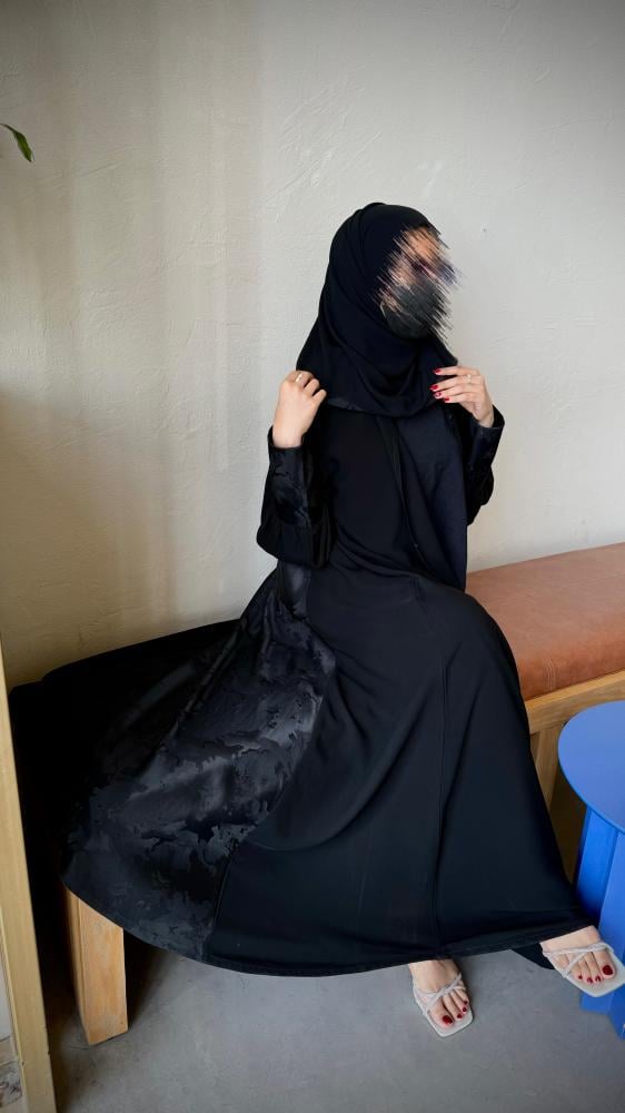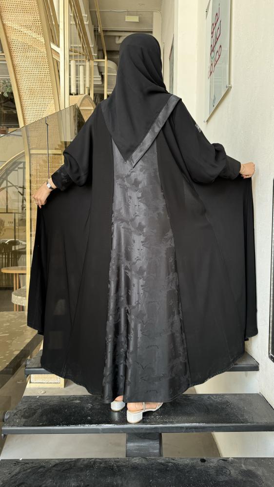 - التصميم: نص كلوش عبايه سادة مع قَصة ظهر طولية من الجاكار عالي الجودة.