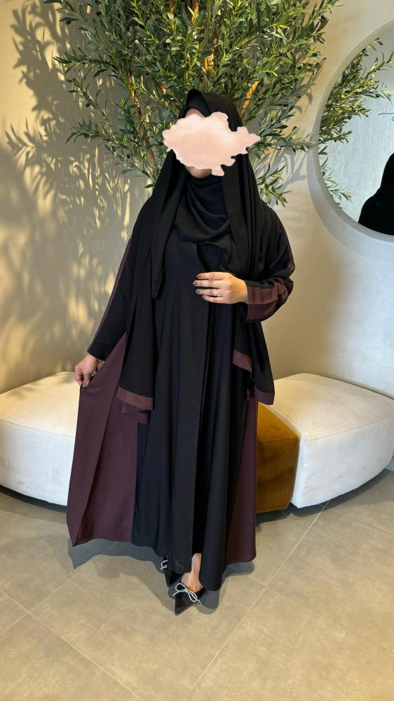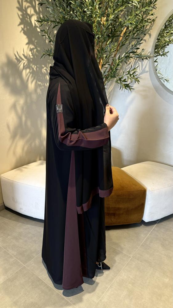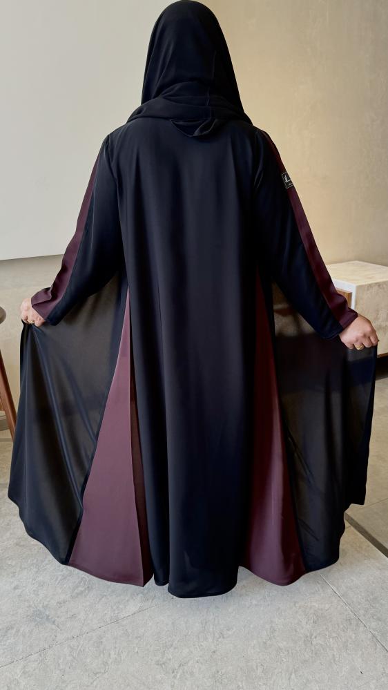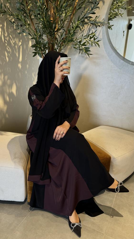 - التصميم: نص كلوش عبايه بقَصات مثلثة على الجانبين وفي الأكمام بلون مختلف، تصميم واسع وفضفاض